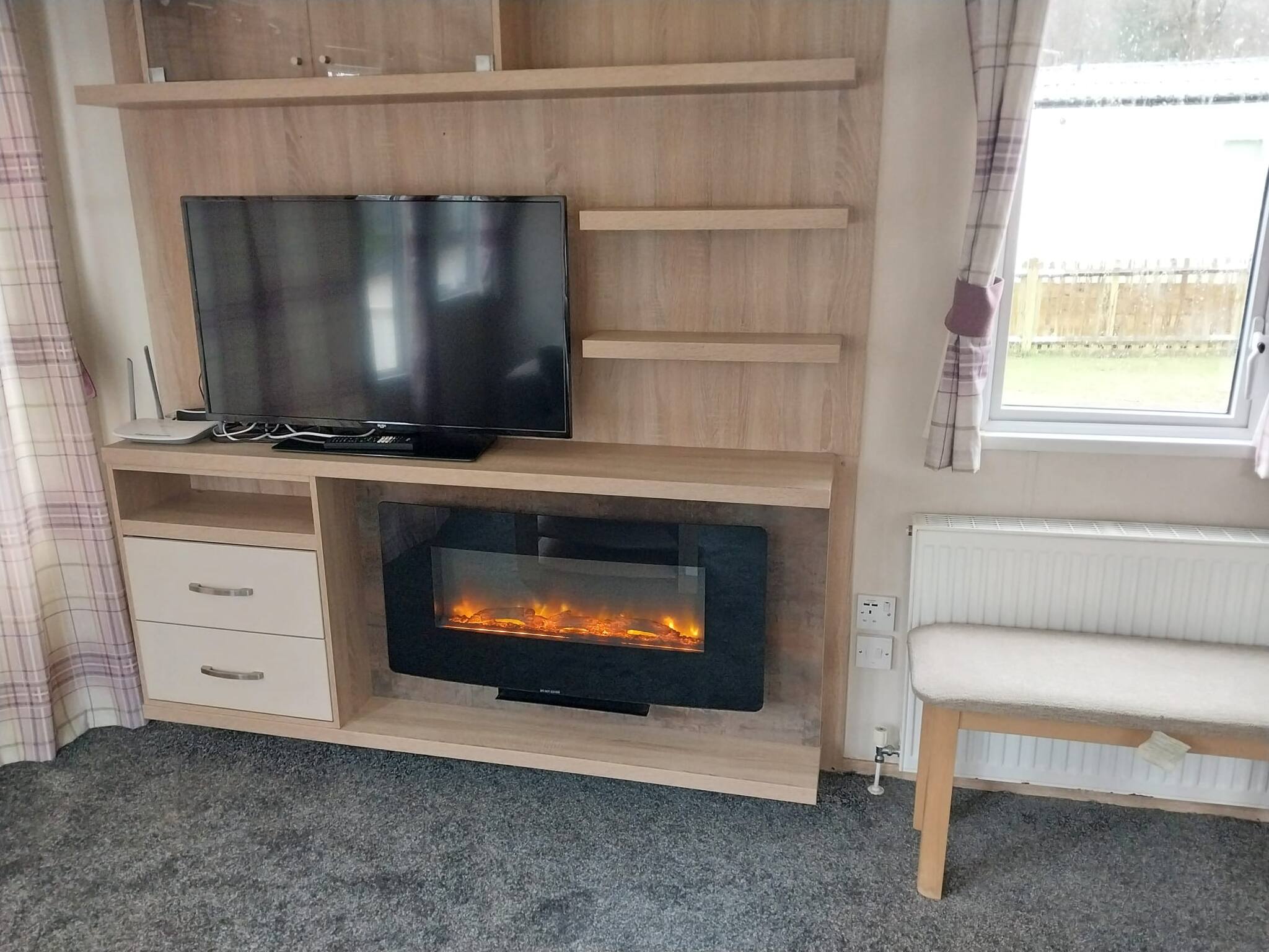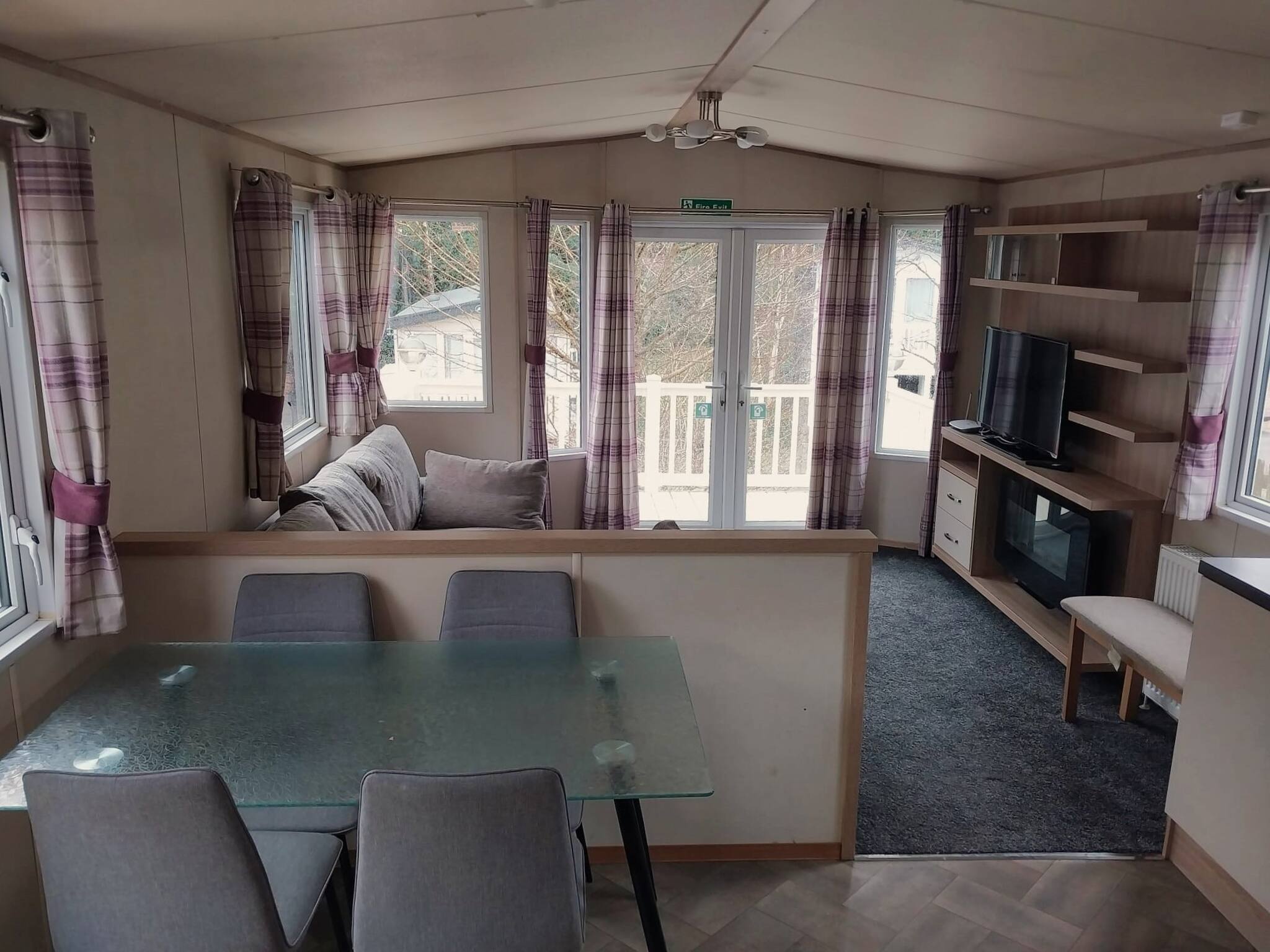 The bright and welcoming lounge area features a double sofa bed, stylish fitted furniture, an electric fire, and a TV—perfect for cosy evenings in. The kitchen comes fully equipped with a fridge, freezer, oven, microwave, toaster, and kettle, while the adjacent dining area seats four comfortably.