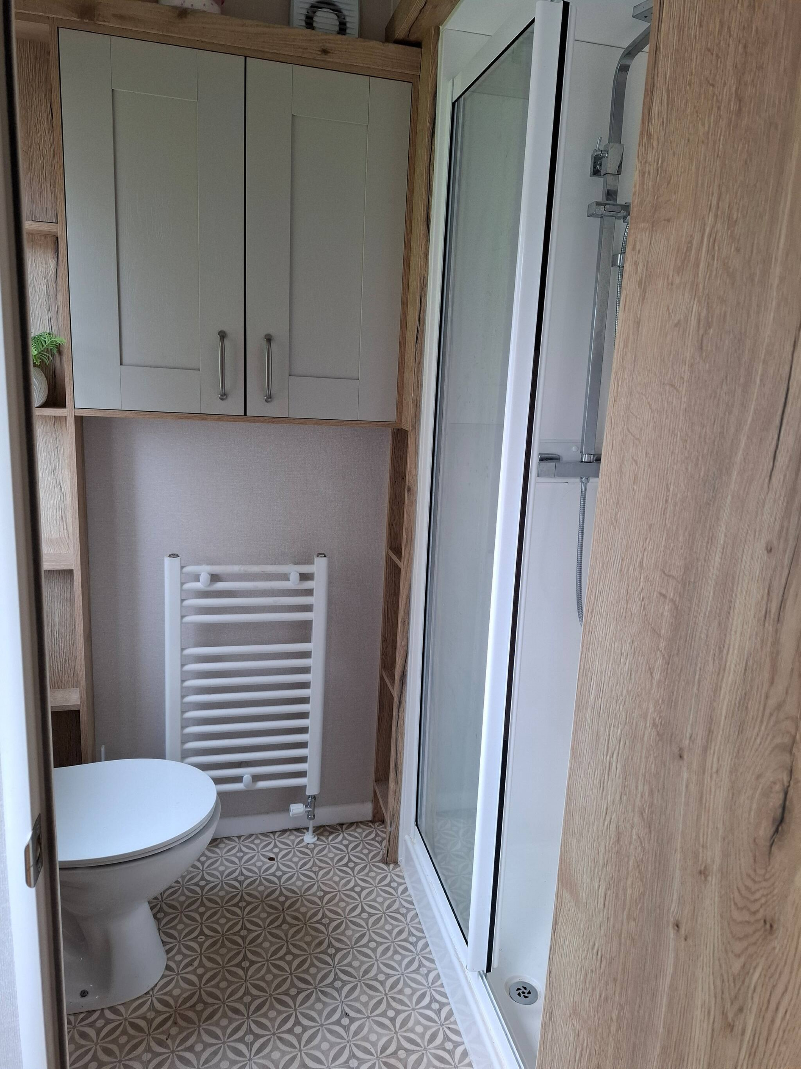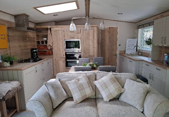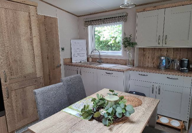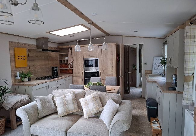 The bright and welcoming lounge area features a double sofa bed, stylish fitted furniture, an electric fire, and a TV—perfect for cosy evenings in. The kitchen comes fully equipped with a fridge, freezer, oven, microwave, toaster, and kettle, while the adjacent dining area seats four comfortably.